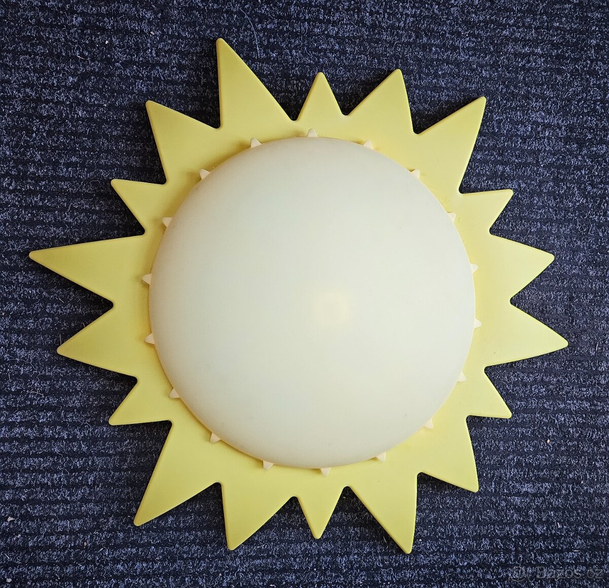 Prodám dětské stropní světlo Slunce se třemi žárovkami E14 a s přidaným LED modulem (viz.obrázky). Nejširší průměr (včetně paprsku) 67cm