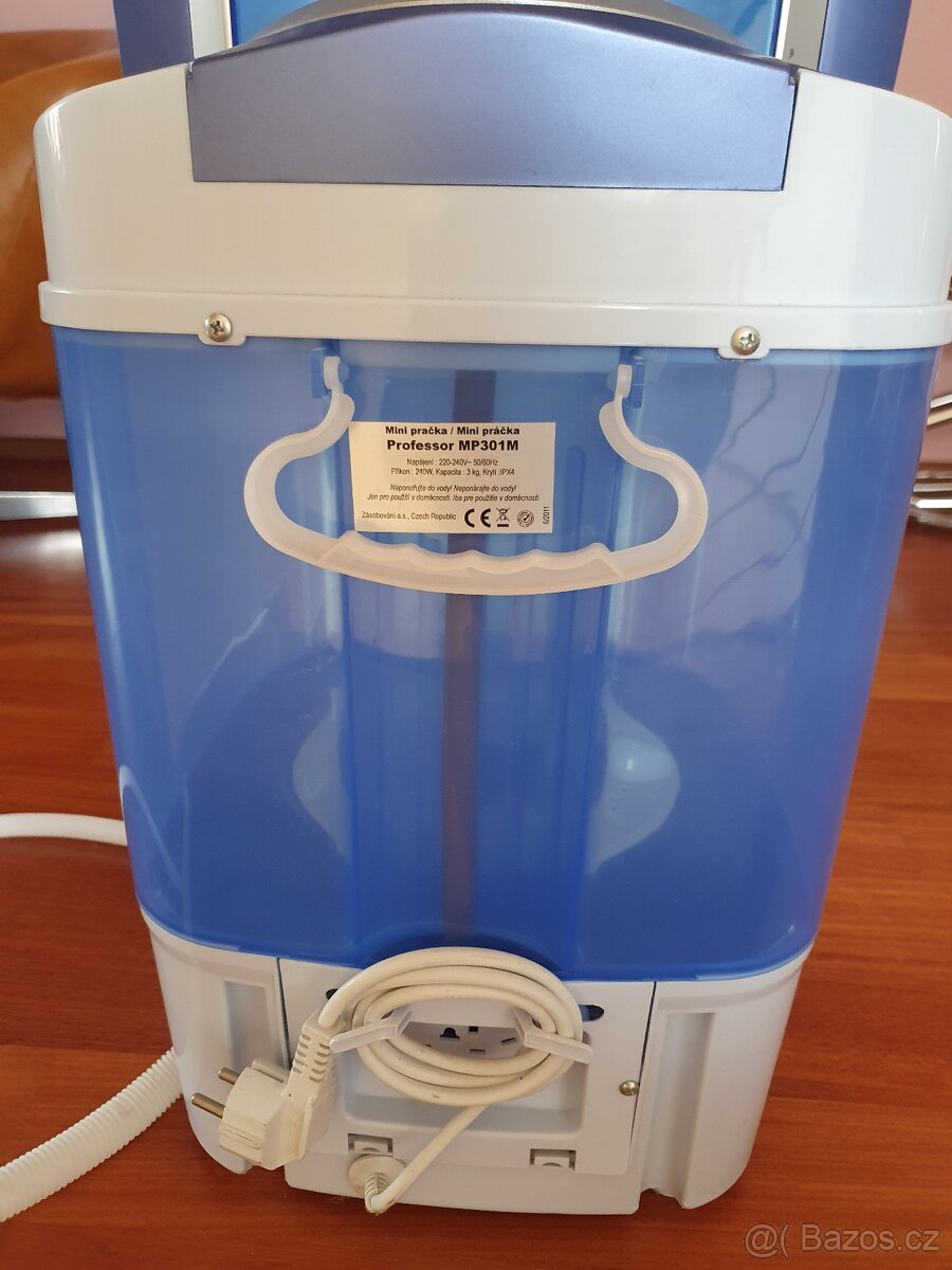 Prodám minipračku zn.Professor MP301M.Mini pračka umožní vyprat si prádlo v kempu i na cestách. Je lehce přenosná, dokáže vyprat až 3kg suchého prádla. Pračka se jednoduše používá. Hadici přívodu vody stačí připojit ke kohoutku a druhý konec k pračce. Do bubnu se nechá natéct dostatek vody. Mini pračka je vybavená integrovaným časovačem, pomocí kterého lze nastavit čas praní. Ideální doba pro praní velmi znečištěného prádla je 12 až 15 minut. Jakmile pračka dopere, pomocí vypouštěcí hadice se vypustí špinavá voda, oblečení se vyždímá, vrátí se do bubnu a zvolí se doba máchání. Mini pračka je vhodná na dovolené, do kempu do studentského pokoje či na chatu. Pračka byla málo používaná a je v perfektním stavu. Cena 1.400Kč