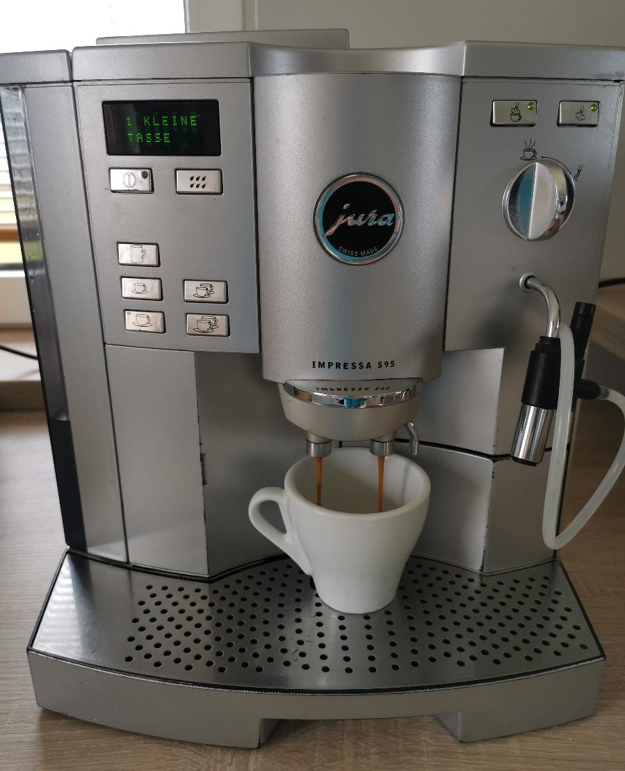 Automatický kávovar Jura Impressa S95, plně funkční, používaný doma, pravidelně čištěný a servisovaný. Dělá výbornou kávu, včetně automatické trysky na mléčnou pěnu. Zvládne udělat espresso, cappuccino, latte macchiato,... Mnoho funkcí a nastavení: teplota kávy, síla kávy, množství vody, automatické zapnutí v určený čas, automatické vypnutí, automatické programy na čištění a odvápnění, hrubost mletí kávy, horká voda na čaj, možnost přípravy kávy i z mleté kávy, ohřívač šálků, nasvícení plochy. Viz 10 fotografií. Kávovar mohu spolehlivě dovézt v okolí nebo zaslat kurýrem.