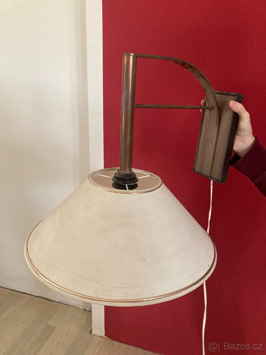 Nabízím lampu na zeď s látkovým stínítkem. Konstrukce je z mědi a je určena pro uchycení do zdi. V případě zájmu mohu nabídnout i jeden nepoužitý širm navíc. Cena za komplet (oba širmy). Pouze osobní převzetí - Mělník, Mšeno, Praha, Mladá Boleslav.