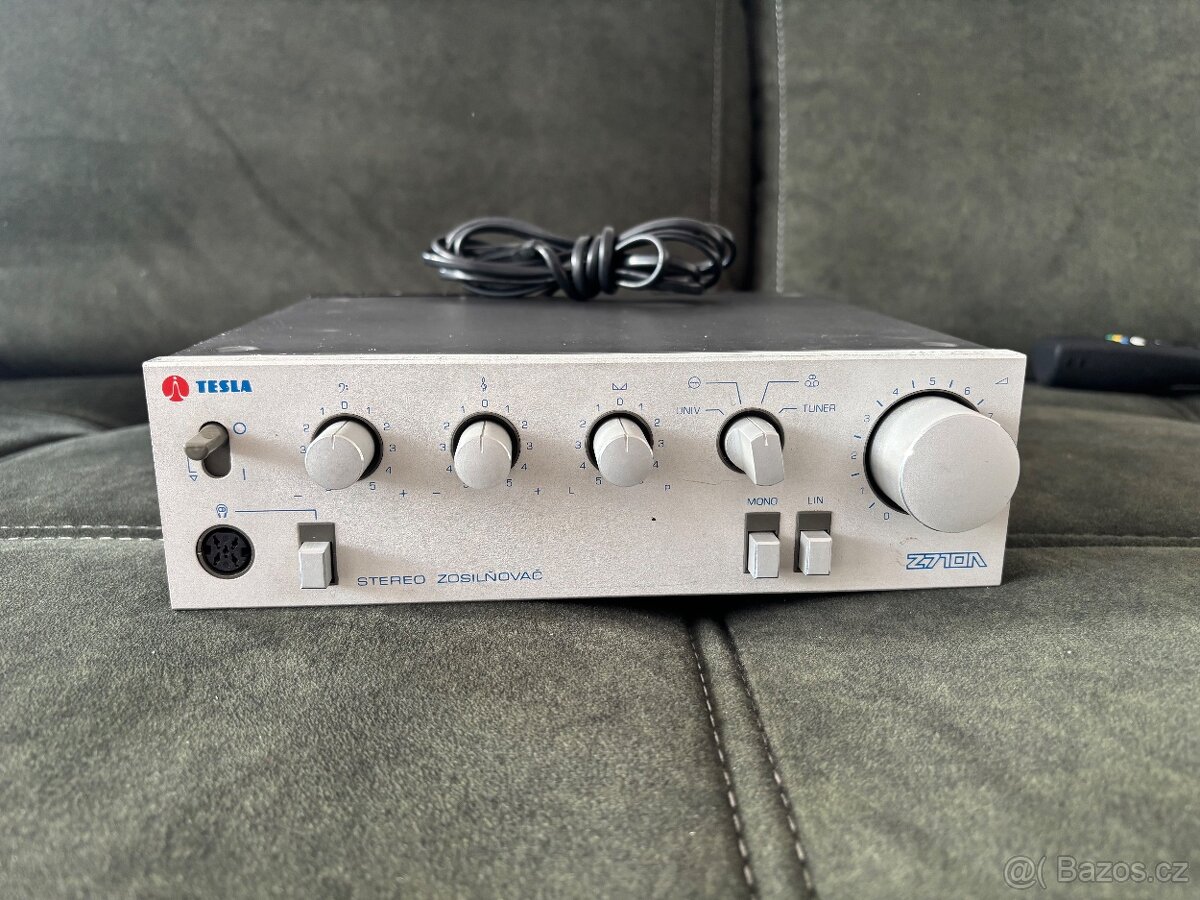 Dobrý den, prodám zesilovač Z710A - výkon 2x 10W. Ovládání hlasitosti, výšek, basů a vyvážení kanálů, vypínatelná fyziologie hlasitosti, přepínač vstupů, přepínač mono/stereo a vypínač reproduktorů, výstup na sluchátka. Funguje dobře má lehké škrábance.