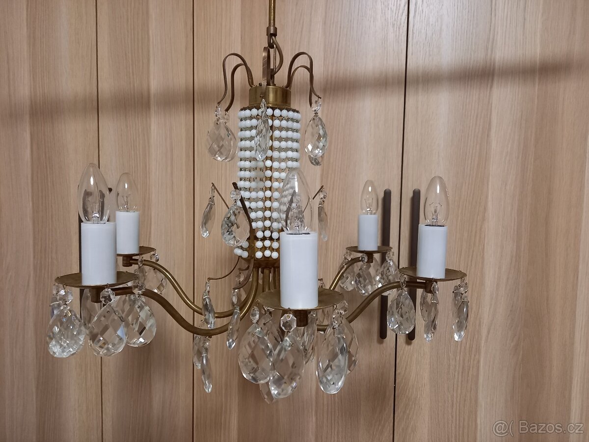 prodám mosazný lustr s ověsy v dobrém stavu, lustr je plně funkční, ověsy jsou bez poškození, jen osobní odběr