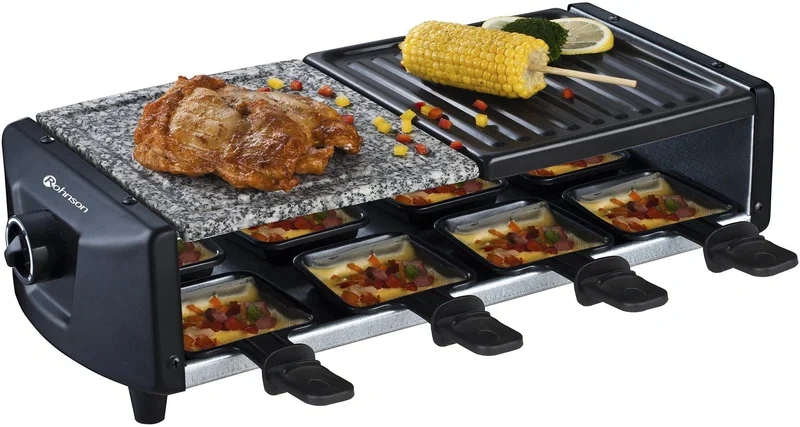 Prodám elektrický stolní gril značky Rohnson R 274 pro grilování bez tuku, kombinovaná grilovací plocha přírodní kámen a nepřilnavý grilovací rošt - vyjímatelné omyvatelné v myčce, 8 malých pánviček s nepřilnavým povrchem, termostat s plynulou regulací teploty, světelná kontrolka.