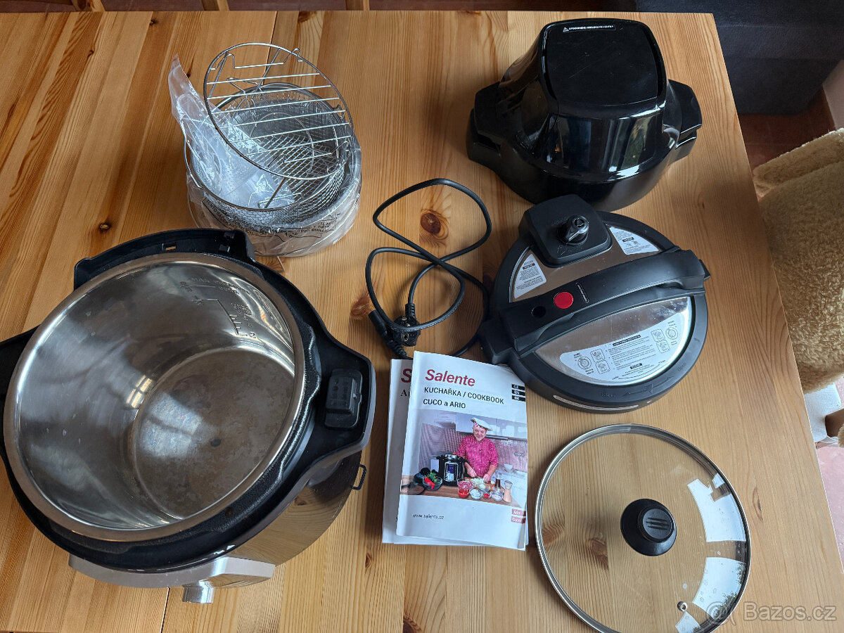 Multifunkční hrnec Salente CUCO, 5x použitý, kompletn, příkon 1 200 W, objem hrnce 6 l, vnitřní teflonový povrch, 53 programů vaření, zdravější vaření s minimem tuku, LED displej, rozměry: 35 × 33 × 33 cm, hmotnost 3,8 kg