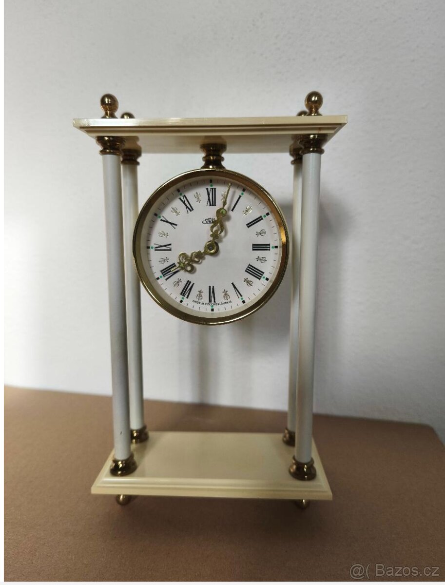 Retro stolní hodiny značky Prim-sloupkové-Made in Czechoslovakia. Netestované. Mechanický strojek.