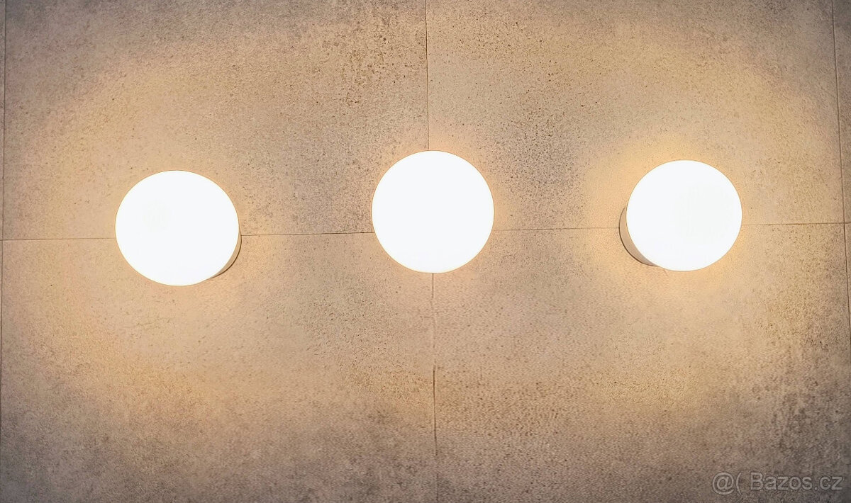 Prodám tři nástěnná světla (bez žárovek). Klasická žárovka, max 100W, patice E27. Kulová stínidla z mléčného skla, průměr 15 cm. Objímka z bílého plastu, průměr 11 cm.