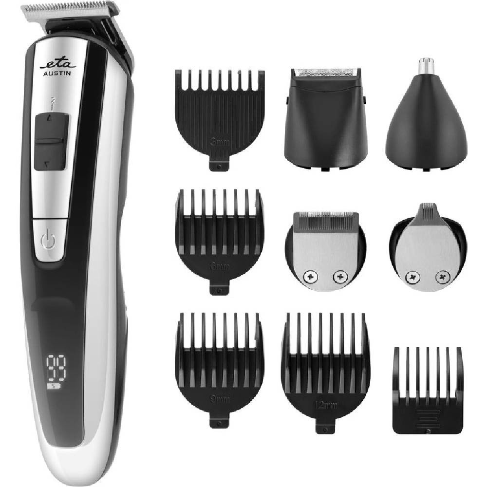 Zastřihovač vlasů ETA Austin 8345 90000 dokonale upraví nejenom vaše vlasy, ale poradí si také s vousy a nechtěnými chloupky v nose a uších. Odnímatelná zastřihovací hlava je vybavena velmi kvalitním titanovo-keramickým ostřím, na které je možné snadno nasadit 5 hřebenových nástavců, nebo 4 stříhací nástavce.