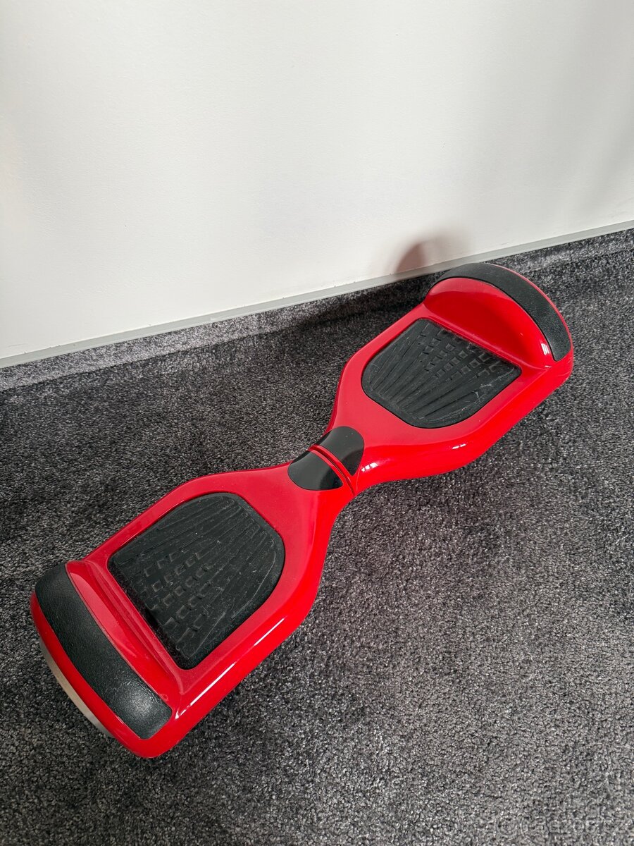 Červený hoverboard na nabíjení, bohužel k němu nemám nabíječku a je na nějakých místech poškrábaný(viz.fotky), ale na funkčnost to nemá žádný vliv.