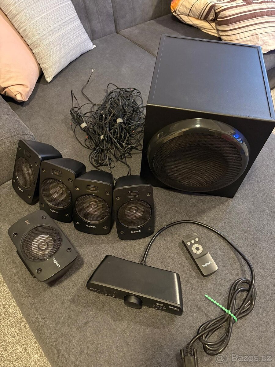 Zvukový systém Logitech Z906 s veškerou kabeláží a příslušenstvím.