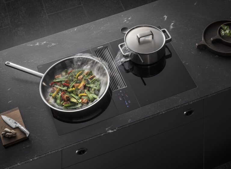 Intuitivní dotykové ovládání přes ovládací panel na odsavači integrovaném do varné desky, varná deska a odsávání zcela zapuštěné, nadměrně velká varná zóna s celoplošnou indukcí.