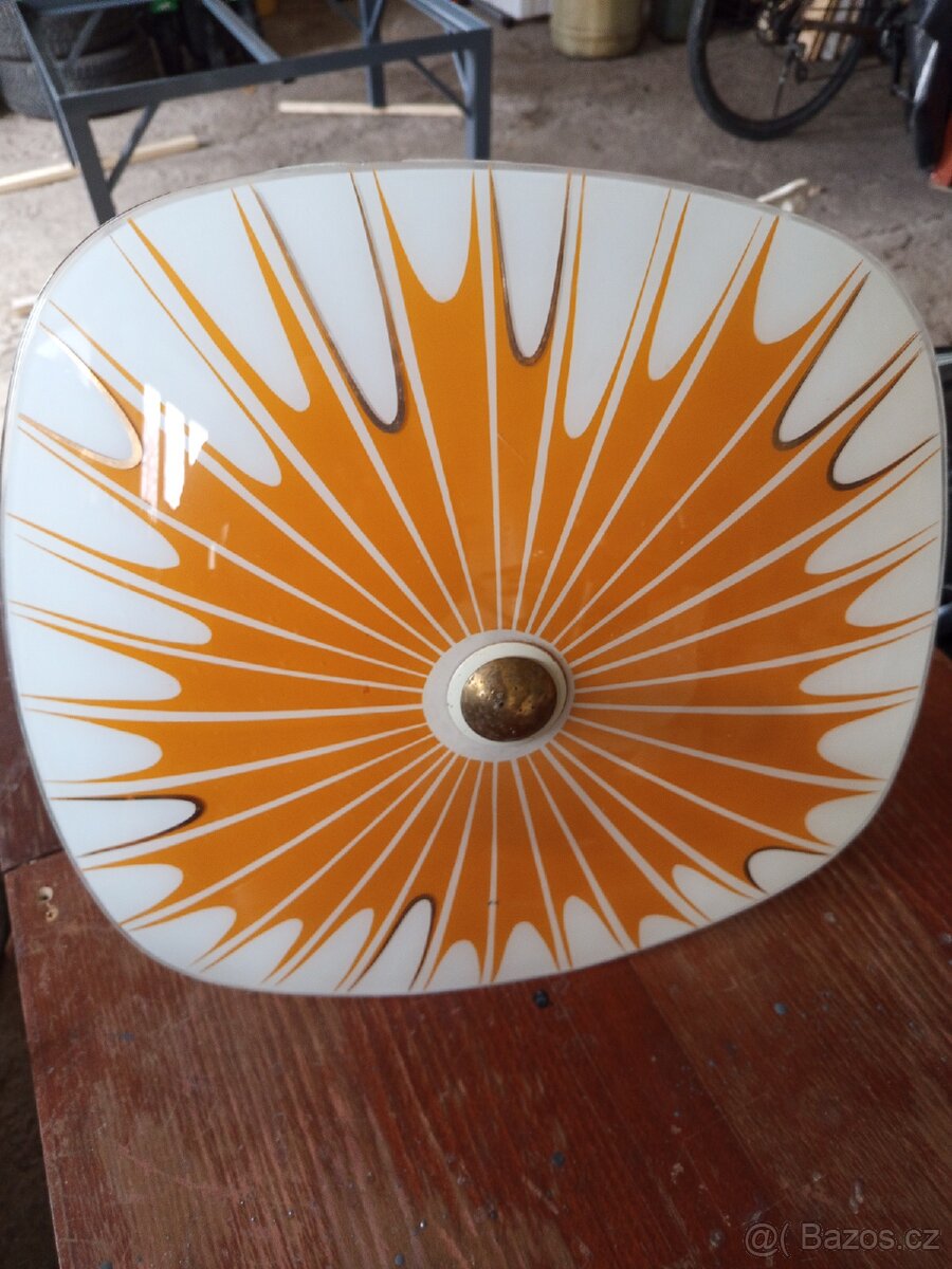 Retro lustr - talíř - [19.4. 2026]Prodám kompletní talířový lustr s potiskem, na tři žárovky se závitem E27, průměr talíře 50 cm, délka závěsu 60 cm, sklo bez poškození.