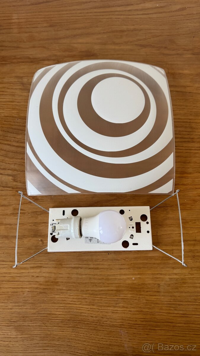 Stropní svítidlo skleněné matné s obv. dekorem průměr 34 cm - [22.4. 2026]Prodám použité skleněné stropní svítidlo s obvodovým dekorem. Matné sklo, stříbrná plastová krytka, bílá objímka s protikusem na žárovku E27. Průměr stínítka 34 cm, výška 10 cm. Výborný stav.