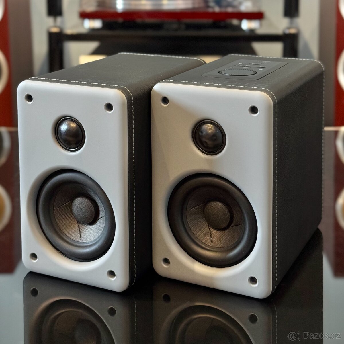 JAMO DS4 je 2-pásmová aktivní regálová reprosoustava s bassreflexem. Bluetooth. Dřevěné ozvučnice potažené koženkou. AUX vstup, USB pro napájení přehrávače. Barva černá.