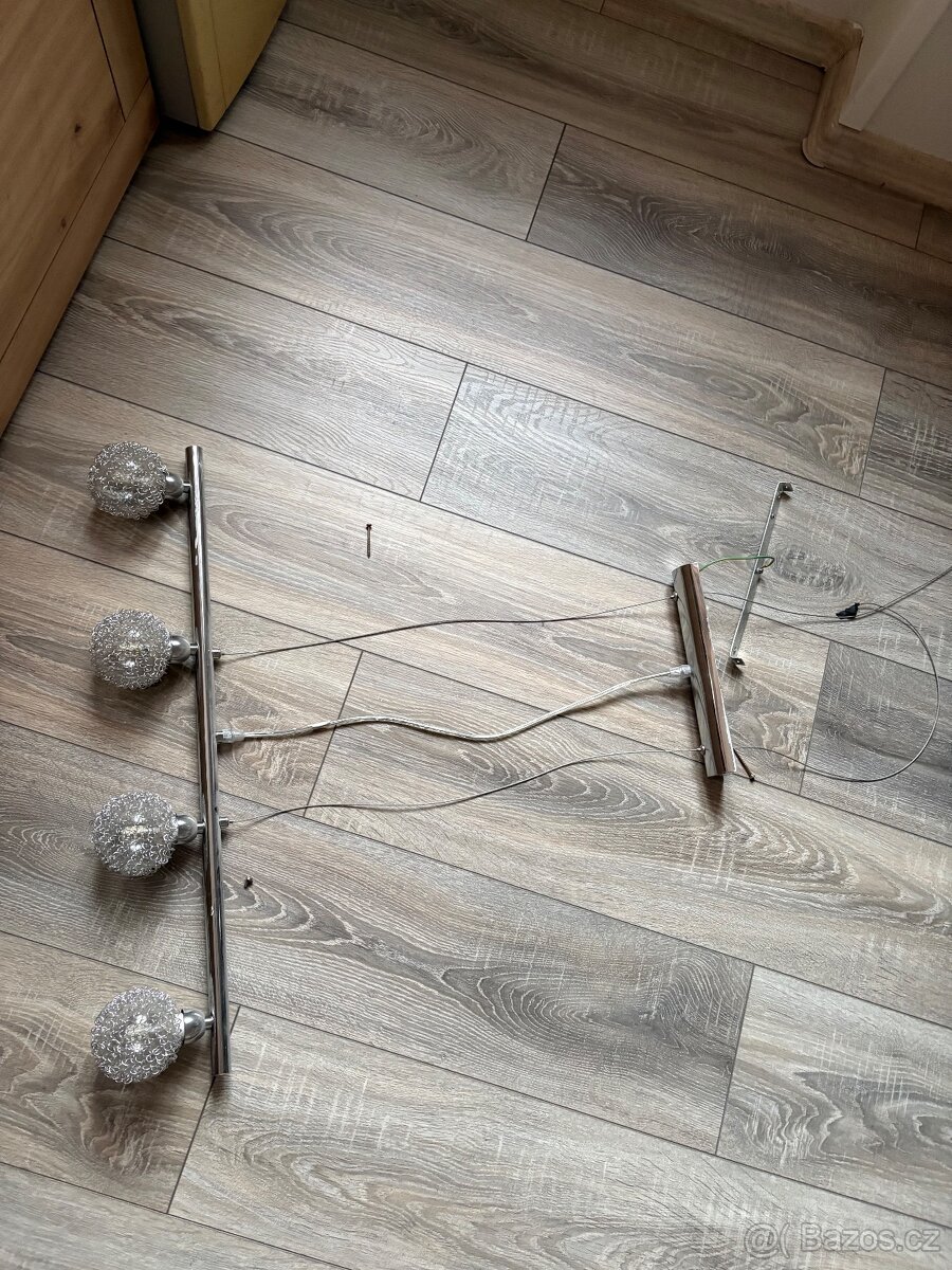 1. Lišta 66cm délka lanka 105 cm, lze i do vysokých místností, lehce posunout. 4 žárovky. Lze halogen i led žárovku.