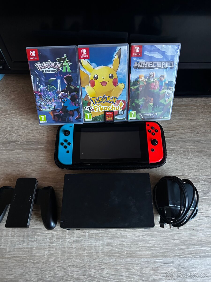 Konzole i Joy-Cony fungují bez problémů. Displej má drobné škrábance z běžného používání, na zadní straně také kosmetické opotřebení. Dock je plně funkční, ale má menší vizuální poškození. Chybí zadní stojánek (kickstand).