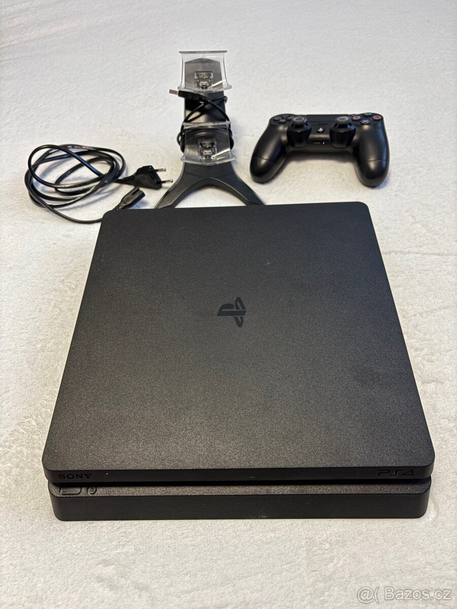 Prodám playstation 4 slim s 1 ovladačem,dobijecí stanicí na 2 ovladače + 2 hry (minecraft,gta5)