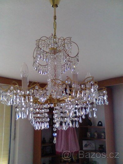 Prodám funkční,krásný křišťálový lustr a boční světlo. Délka od stropu je 86 cm, lze zkrátit. Šířka je 57 cm. Lustr je opatřen 5 svíčkovými žárovkami.